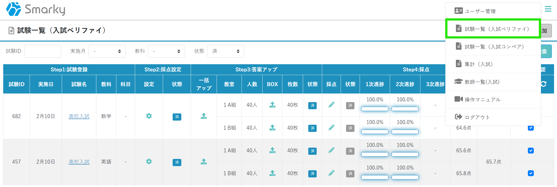 ① 右上のメニューから、試験一覧(入試ベリファイ)を選択します。