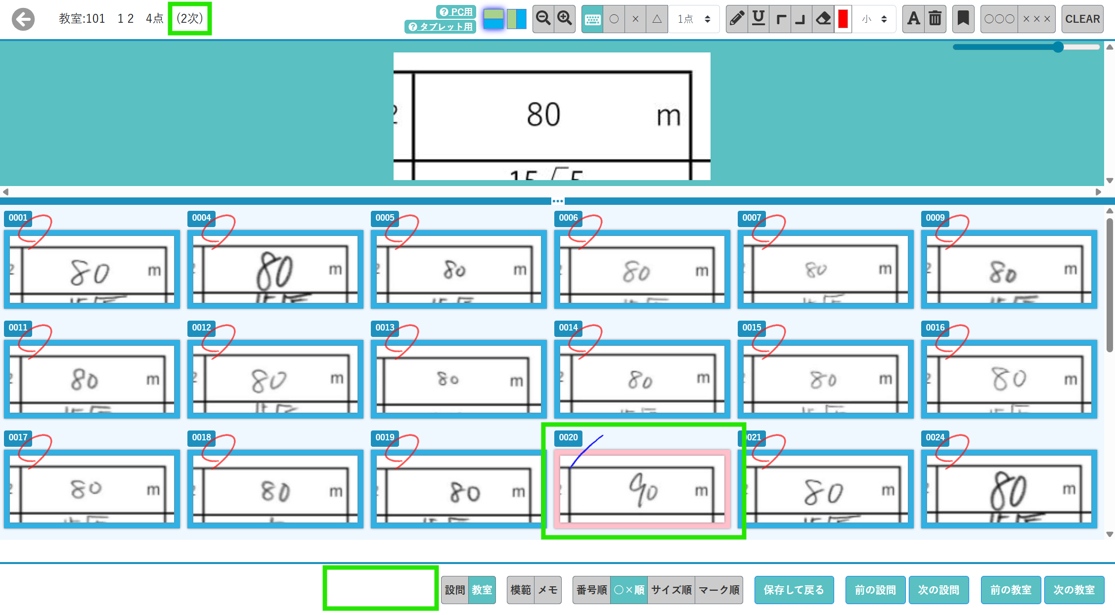 ② 2次採点者以降の表示は「○×順」に表示します。採点を修正した箇所は「青字」で反映されます。