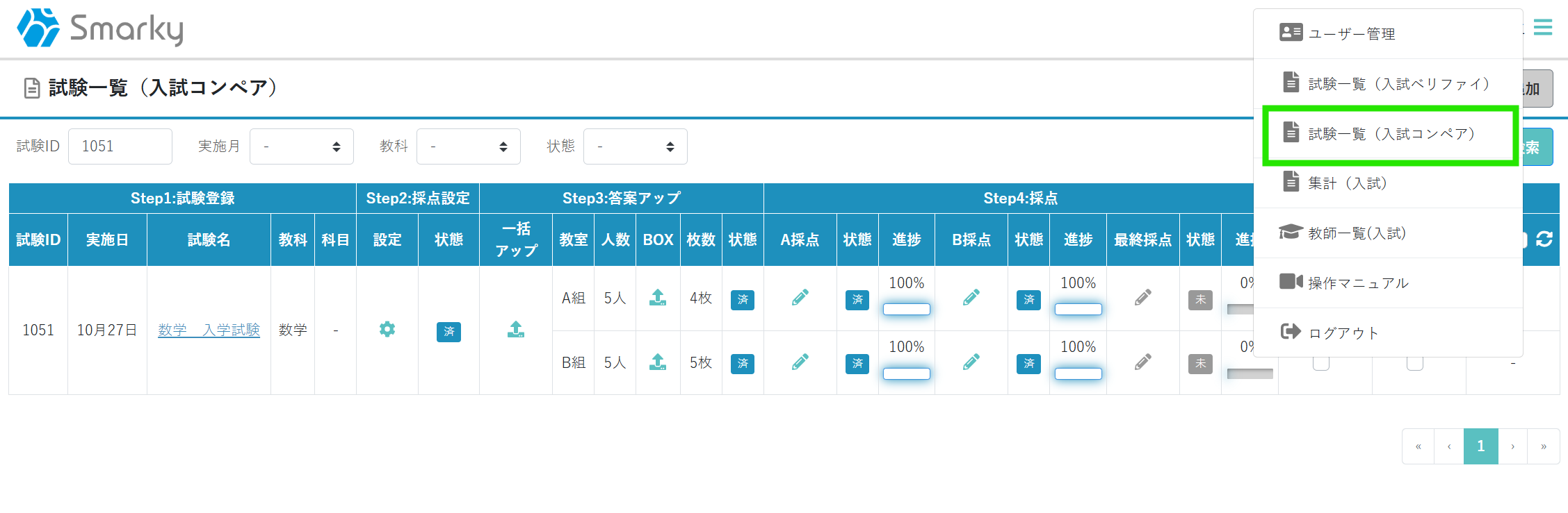 ① 右上のメニューから、試験一覧(入試コンペア)を選択します。