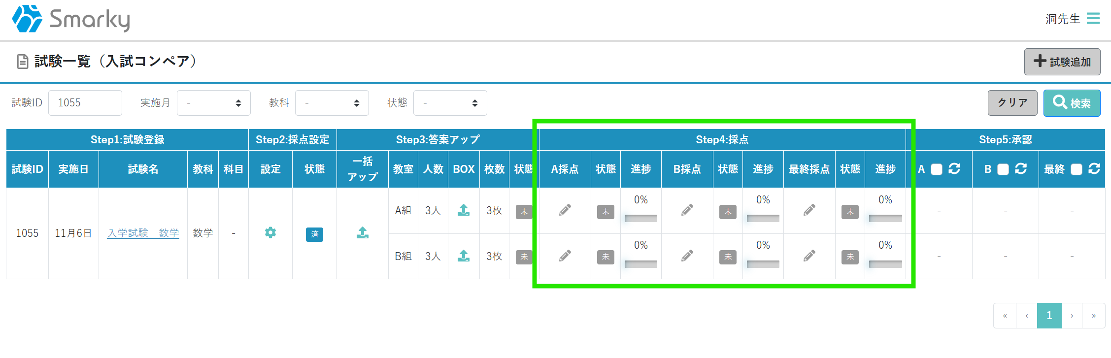 採点者別に入試試験一覧の「採点」アイコンをクリックすると、該当教室の採点Top画面へ遷移します。