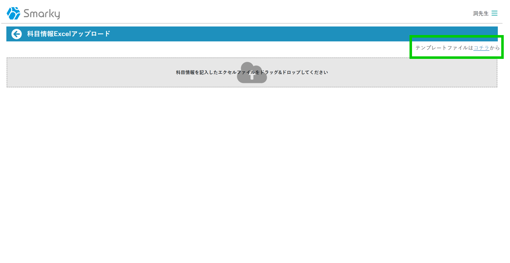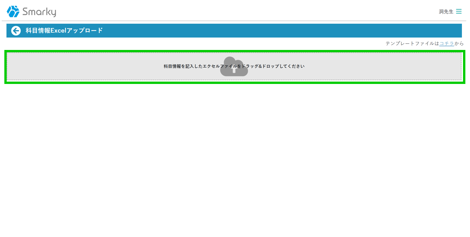⑤データを入力したテンプレートファイルを科目情報Excelアップロード画面のグレー部分にドラッグ&ドロップします。
