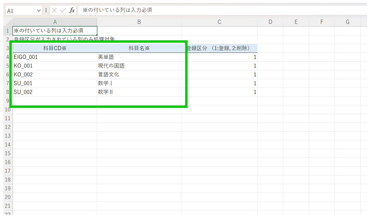 ④テンプレートファイルに科目情報を入力します。科目CDは任意で設定可能ですが重複しないユニーク値としてください。
