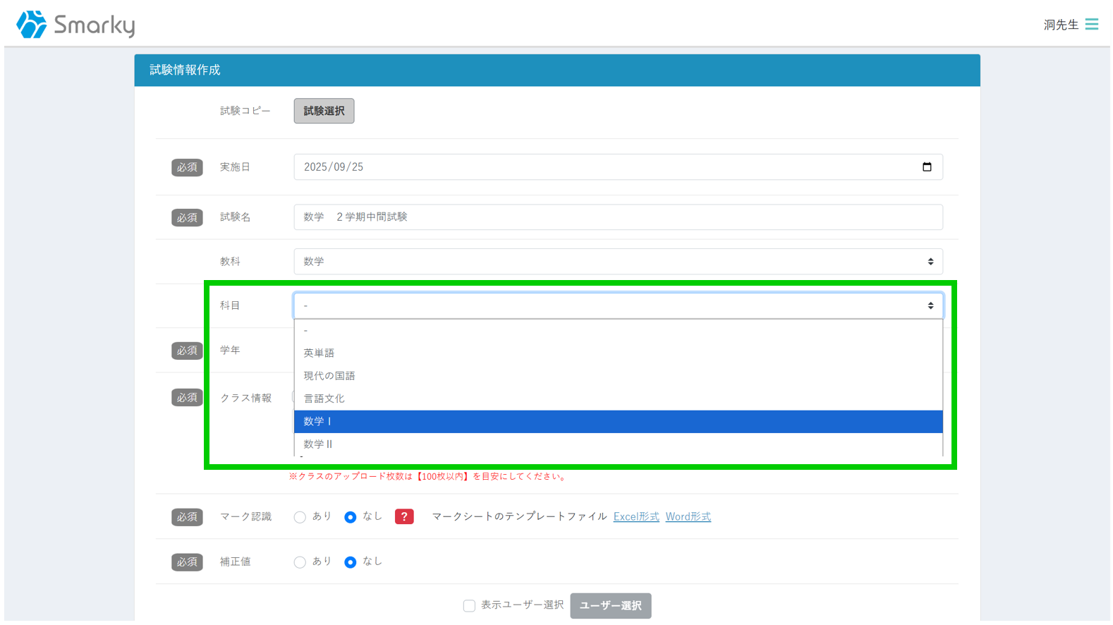⑦登録された科目情報は試験情報画面の「科目」の項目でプルダウン選択ができるようになります。試験に合わせた設定を行ってください。